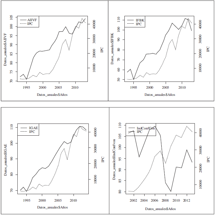 En esta investigación el sector real se representa por medio de las siguientes variables: índice de volumen físico de la actividad industrial (AIIVF), inversión fija bruta de capital (IFBK), indicador global de la actividad económica (IGAE) y el índice de confianza del consumidor (ICC) para un periodo de 20 años comprendidos entre 1993 y 2013, excepto el índice de confianza que comenzó a publicarse en 2001. Estrictamente la variable ICC no pertenece al ámbito real, pero se decidió incluirla para analizar la información que el mercado financiero porque aporta de manera directa a las expectativas y opiniones del público, particularmente a productores e inversionistas. Para representar el rendimiento en el mercado financiero se tomó el índice de precios y cotizaciones (IPC) para un periodo similar. Los datos provienen de inegi y Yahoo Finance y son de periodicidad anual.