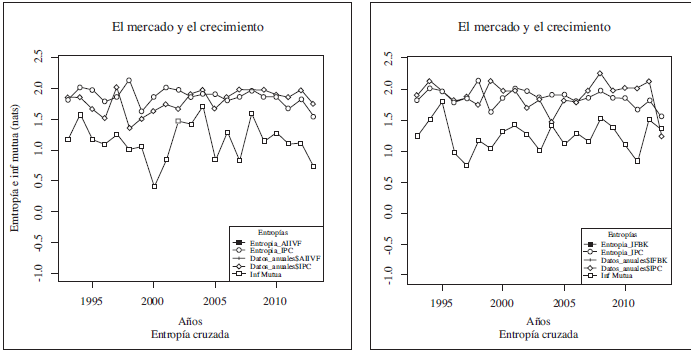 Por otra parte, la idea de dependencia va de la mano con la cantidad de información que una variable aporta sobre la otra, un sistema que comparte mayor cantidad de información tenderá a mostrar una estructura de dependencia mayor, la cual, a diferencia de los resultados que se obtienen bajo los estudios tradicionales, no es constante, sino que cambia frecuentemente y exhibe tendencias muy marcadas por lapsos. Como se verá más adelante se acepta la existencia de una relación de dependencia ente las variables de estudio al obtener un coeficiente de información mutua diferente de cero, esta dependencia es variable en el tiempo y aumenta o disminuye conforme la ocurrencia de eventos exógenos al sistema.
