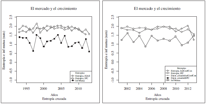En términos económicos, la información conjunta observada por los rendimientos del mercado financiero y las variables económicas reales, puede ser entendida como un sistema que genera y comparte señales, mismas que serán recibidas por los diferentes agentes económicos. Como lo señala Aké et al. (2015), un incremento en el coeficiente de información mutua significa mayor cantidad de información compartida entre la dupla de variables aleatorias, lo cual permite que la formación de expectativas entre los agentes económicos se realice de manera más eficiente. Por el contrario, la disminución en dicho indicador significa la desconexión entre las variables de estudio y, por lo tanto, las expectativas del público se verán afectadas por elementos no considerados en el sistema.