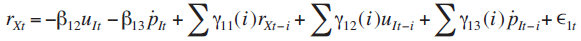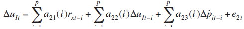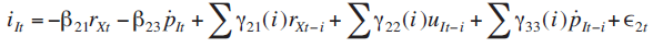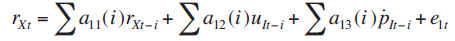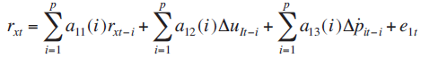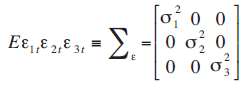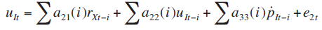 En este sistema las y representan los parámetros de las variables en términos contemporáneos y rezagados respectivamente y representa las innovaciones o choques con media cero y varianza constante.