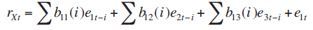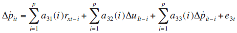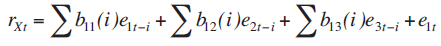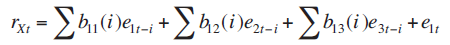 Por lo tanto, para propósitos de identificación de la estructura de la relación dinámica de las variables presentadas en el modelo teórico, el modelo de vectores autorregresivos, presentado en las ecuaciones (13') a la (15'), tiene la siguiente representación de medias móviles (Enders, 2003:69):