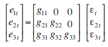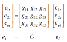 en (23), es necesario imponer (n2-n)/2 restricciones para identificar completamente el sistema (Enders, 2003: 71). En función de la dimensión de la matriz, deben ser tres restricciones en G para identificar