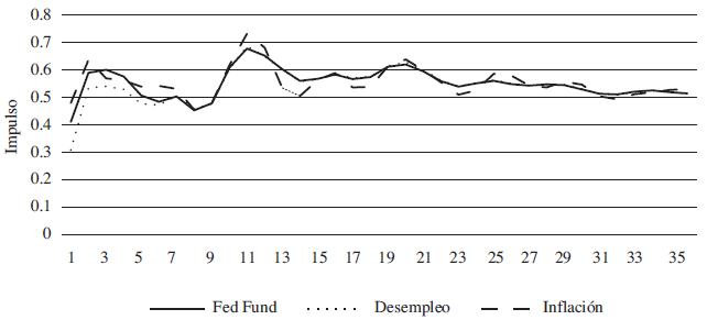 Por su parte, la inflación es explicada por los impulsos de oferta y demanda agregada local y por la política monetaria de Estados Unidos. Esto es compatible con los modelos de flexibilidad de precios y apoya aún mas la conjetura de que la economía debe ser estimulada más por el lado de la oferta que por el de la demanda, pero con la salvedad de que es altamente dependendiente a los movimientos de los choques de demanda agragada de los Estados Undos a través de los impulsos sobre la tasa de fondos federales, la cual actúa como instrumento intermedio de política monetaria en Estados Unidos.