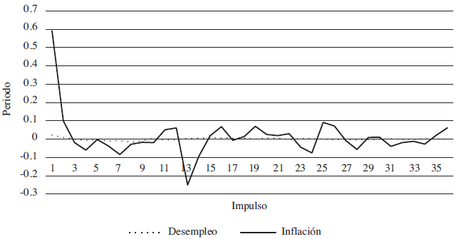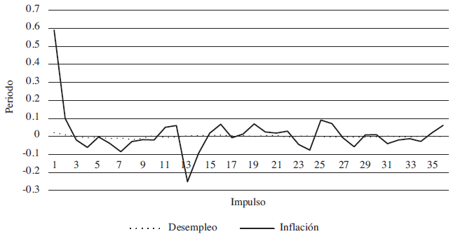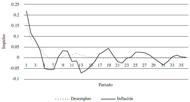De acuerdo las funciones impulso-respuesta, la tasa de desempleo es afectada, de manera persistente, por los impulsos de la demanda agregada de Estados Unidos a través de su instrumento intermedio de política monetaria. Por su parte, los choques de oferta tienen un efecto positivo en el primer mes pero luego de un período de 7 meses, vuelve a su nivel normal. Los choques de demanda no tienen prácticamente efectos sobre la tasa de desempleo.