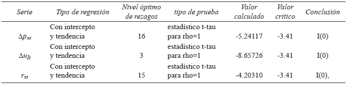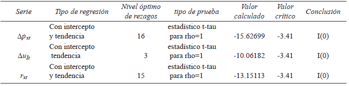 Las restricciones teóricas y metodológicas, presentadas en la sección anterior, imponen que las series de estudio sean estacionarias. Es decir, con un orden de integración I(0). Los Cuadros 1 y 2, muestran los resultados de las pruebas de raíz unitaria aplicada a las variables de estudio. En los mismos, se incluyen el tipo de regresión que mejor se ajusta a la relación establecida para realizar estas pruebas, el número de rezagos seleccionados de acuerdo a los criterios de selección Akaike y Schwartz y el tipo de prueba junto a los valores calculados y críticos así como el orden de Integración (Maddala y Kim, 2003:61). Según los Cuadro 1 y 2, las pruebas de raíces unitarias indican que todas las variables de estudios son estacionarias. Es decir, su orden de integración es I(0).