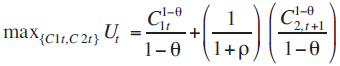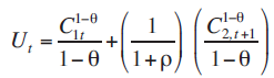 Dónde: C1,t es el consumo en el periodo t que corresponde al primer periodo de los jóvenes y C2,t corresponde al consumo realizado en el segundo periodo t+1 y representa el consumo de los viejos, la variable θ mide la concavidad de la función de utilidad. En este modelo se asume el supuesto de que los individuos prefieren consumir más o menos igual a través del tiempo. Para esto, ρ es la tasa de preferencias intertemporales.