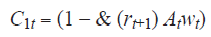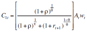 El consumo es función del trabajo, la remuneración eficiente y el nivel de ahorro; que quedará conformado por la tasa de interés, producto del ahorro rt + 1, el nivel de preferencia por consumir o ahorrar en el periodo joven (ρ) y de la magnitud en la variación del consumo (θ). Por consiguiente, en el segundo periodo vivirá de lo ahorrado en el periodo uno, lo cual se puede representar de la siguiente forma: