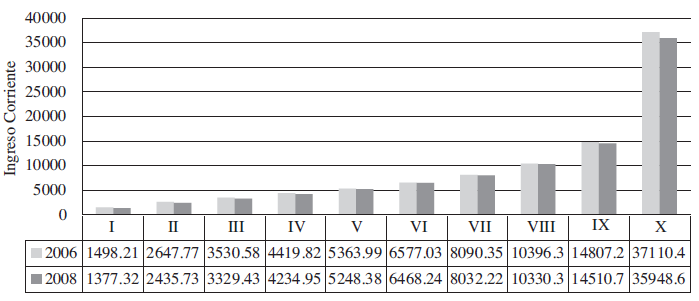 Con la información de la Encuesta Nacional de Ingresos y Gastos de los Hogares (ENIGH) a precios constantes de 2008, se encontró que en México, la población entre el 2006 y 2008 recibió en promedio un ingreso de $9,192.00 por trimestre, sin embargo en el decil más bajo la población solo contó con un ingreso promedio trimestral de $1,438.00, en contraste con el decil más alto de la población que percibió un ingreso promedio de $36,529.00. En la gráfica 1 se representa el nivel de ingresos para cada decil de ingreso y se observa la brecha de ingreso entre el primer y último decil que corresponde a una diferencia de más de 25 veces, para el periodo 2006 y 2008.