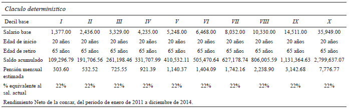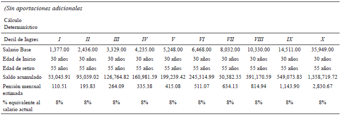 El modelo muestra que con las aportaciones programadas por la ley, el individuo obtendrá al retiro una pensión equivalente al 22% de su salario actual. Se observa que los primeros siete deciles de la población con su nivel de ingreso actual, al momento del retiro no pueden garantizar una pensión equivalente a un salario mínimo, motivo por el cual el Estado tendrá que intervenir y garantizar una pensión de al menos un salario mínimo.