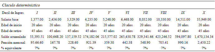 En el primer decil y desde el punto de vista determinístico, el ingreso mensual es de $1,377.00 proyectado a 45 años, obteniendo un saldo acumulado de retiro de $109,296.79. Con este monto la población que se encuentra en este decil obtendría una pensión de $308.60 la cual es equivalente al 22% de su ingreso actual. Se observa que la pensión al momento del retiro con un 95% de confiabilidad, puede alcanzar valores máximos de 480.77 y al 5% obtendría un valor mínimo de 185.37. Al final de los treinta años contemplados como expectativa de vida, el panorama cambia ya que el máximo puede ser de $176.24 y como margen mínimo se contempla una pérdida de $78.16.