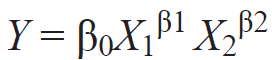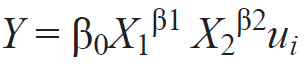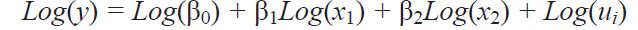 Para transformar el modelo estadístico Cobb-Douglas (Cobb y Douglas, 1928; Douglas, 1976) a un modelo econométrico, bivariado y seudocuadrático (Gujarati y Porter, 2009: 526) y obtener los coeficientes de regresión, se linealizó el modelo, tomando el logaritmo en ambos lados de la ecuación, quedando como sigue: