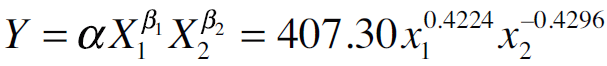 Al aplicar el antilogaritmo a los coeficientes de la función anterior se obtuvo la función no lineal Cobb-Douglas