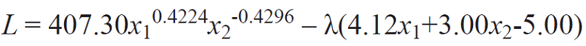 La optimización de la función Cobb-Douglas comenzó con el proceso algebraico, de restar a la función objetivo la restricción, denominada Multiplicador de Lagrange (Henderson y Quandt, 1995; Frank, 2009: 90). Esta función también se le llama función de producción tipo Cobb-Douglas seudocuadrática no lineal: