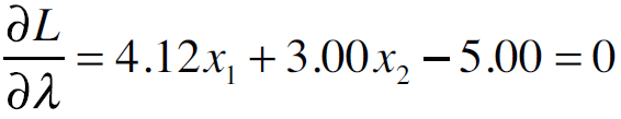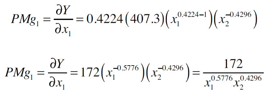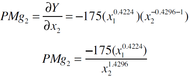 Donde PMg1 es el producto marginal del primer insumo y PMg2 el producto marginal del segundo insumo. El sistema se soluciona en términos del valor calculado de las X (insumos variables). Los insumos x1 (alimento concentrado) y x2 (forraje) caracterizan a una isocuanta (Nicholson, 2007; Rebollar et al., 2016).