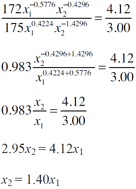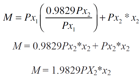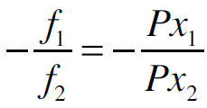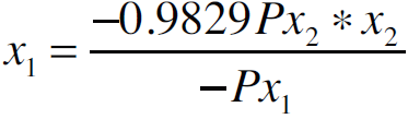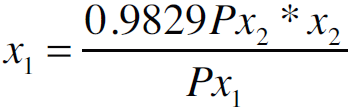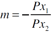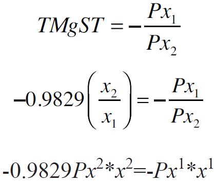 Donde Px1 es el precio del insumo x1 referido al concentrado, Px2 el precio del insumo x2 referido al forraje y M el ingreso disponible, en este caso, el precio por litro de leche (precio del producto). Así mismo, en la isocuanta, representa la tasa marginal de sustitución técnica: TMgST.