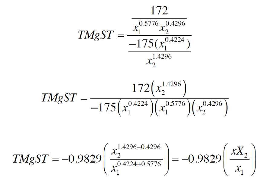 El segundo procedimiento, método simplificado, consiste en obtener la TMgST (Nicholson, 2007), que bajo la teoría de la producción (Henderson y Quandt, 1995), en especial la que tiene que ver con isocuantas (relación técnica insumo-insumo), se expresa como: