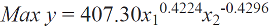 Al sustituir los valores de y en la función Cobb-Douglas se obtiene la cantidad de leche óptima producida (y = 353.80 L), o bien la combinación de los insumos que maximizan la isocuanta.