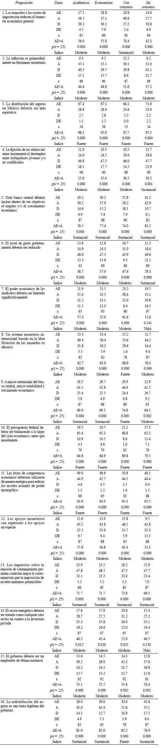 Las proposiciones 3 (distribución del ingreso en México), 10 (presupuesto equilibrado) y 11 (leyes de competencia) son las únicas con índices de consenso global fuertes para los cuatro grupos.