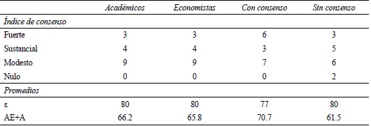 En el Cuadro 3 se muestran los resultados de los indicadores de consenso, para cada una de las proposiciones sobre aspectos científicos de la Economía, de todos los grupos definidos. En el Cuadro 4 se resumen los resultados, observándose que no hubo proposiciones, para algún grupo, que tuvieran índices de consenso global fuerte. Ello se debe a que ninguna proposición cumple con e ≤ 80% (ver Cuadro 3).