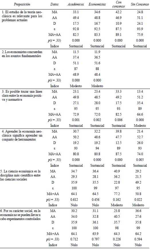 Los encuestados que opinan que los economistas concuerdan en los asuntos fundamentales tienen un mayor grado de consenso que el resto de los grupos. En particular, las sumas de porcentajes de respuesta que manifiestan algún grado de acuerdo para las proposiciones 1 (relevancia de la Economía Neoclásica), 3 (Economía positiva contra normativa), 4 (herramientas de la Economía Neoclásica) y 5 (Economía como ciencia) son mayores. Lo anterior sugiere que estos encuestados tienden a favorecer los postulados de la Economía Neoclásica.