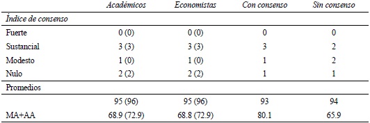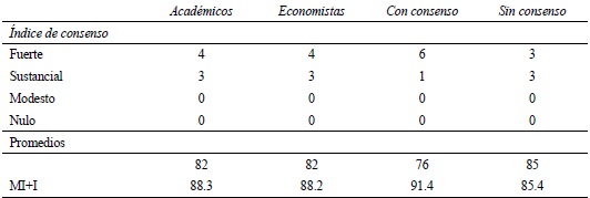En el Cuadro 1 se muestran los resultados de los indicadores de consenso, para cada una de las 16 proposiciones sobre opiniones económicas. En el Cuadro 2 se resumen los hallazgos, observándose que, para todos los grupos, la mayoría de las proposiciones tienen índices de consenso global modestos. Únicamente para el grupo de encuestados que consideran que los economistas no concuerdan en los asuntos fundamentales dos proposiciones sobre opiniones económicas arrojan índices de consenso global nulos.