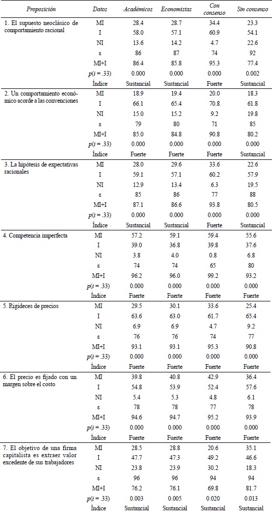 Todos los grupos muestran índices de consenso global fuertes, y con dirección positiva, hacia supuestos neokeynesianos: proposiciones 4 (competencia económica), 5 (rigideces de precios) y 6 (margen sobre costos). Los resultados no son contradictorios, puesto que estos supuestos pueden ser aceptados por personas que favorecen la Economía Neoclásica y aquellas que no lo hacen. Todos los supuestos neoclásicos tuvieron porcentajes de aceptación superiores al 67%, aunque menores a los de los supuestos neokeynesianos.