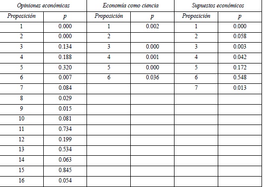 Para analizar los resultados de los grupos de encuestados que consideran que los economistas concuerdan en los asuntos fundamentales y los que no opinan ello se pierde, por supuesto, la Proposición 2 (consenso entre economistas). En el Cuadro 4, los paréntesis indican los resultados de las medidas de consenso para los académicos de la Ciencia Económica y los economistas cuando se excluye la Proposición 2. Para los grupos de académicos de la Ciencia Económica y economistas, dicha proposición tiene un índice de consenso global modesto, derivado de rechazar la hipótesis nula de distribución uniforme de las opciones de respuesta a un nivel de significancia del 10%.7