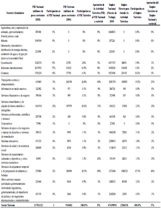La contribución de la actividad turística al PIB y al empleo de los sectores económicos, muestran la siguiente aportación sectorial: Alojamiento temporal y preparación de alimentos y bebidas con el 67.8% en el PIB, 45.7% en el empleo; Transporte, correos y almacenamiento con el 39.6% en el PIB, 21% en el empleo; Servicios de esparcimiento, culturales y deportivos, y otros servicios recreativos con el 20.2% al PIB y el 14.8% en el empleo, mientras que los Servicios inmobiliarios con el 13% al PIB y 11.9% al empleo. Lo anterior, evidencia la importancia económica que tiene el turismo para algunos sectores económicos, mostrando el sector de Alojamiento temporal y preparación de alimentos y bebidas una mayor vinculación turística. (Cuadro 1)