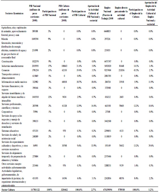 La contribución de la actividad cultural al PIB y al empleo de los sectores económicos, muestran que la mayor aportación sectorial es para el sector de servicios de Esparcimiento, Culturales y deportivos con el 53.9% en el PIB y 39.6% en el empleo, seguida de los sectores información de medios masivos 18.6% en el PIB y 11.9% en el empleo y servicios profesionales, científicos y técnicos 14.4% en el PIB y 10.6% en el empleo. (Cuadro 2)