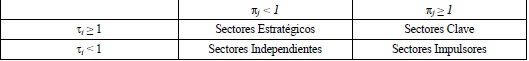 Los sectores con altos encadenamientos hacia atrás y adelante, son considerados sectores clave, pues al ser fuertes demandantes y oferentes de insumos. Los sectores denominados como estratégicos poseen baja demanda de insumos, pero abastecen sustantivamente de insumos a otros sectores; estos sectores pueden constituir posibles cuellos de botella productivos, frente a shocks de demanda. Los sectores impulsores o de fuerte arrastre, con bajos encadenamientos hacia adelante y altos hacia atrás; son sectores impulsores de la economía, suelen poseer consumo intermedio elevado y una oferta de productos que, mayoritariamente, abastece la demanda final. Los sectores considerados como independientes consumen una cantidad poco significativa de insumos intermedios y dedican la producción a satisfacer, principalmente, a la demanda final. Se trata de sectores aislados, que no provocan efectos de arrastre significativos en el sistema económico, ni reaccionan en forma relevante ante el efecto de arrastre, provocado por las variaciones de la demanda intermedia de otros sectores.