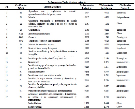 Con la aplicación de la metodología, nuestras estimaciones muestran en el Cuadro 3, que los sectores económicos que cumplen las características de sectores clave son: generación y transmisión de energía eléctrica y gas, industrias manufactureras, turismo y cultura. En el caso de los sectores del turismo y la cultura, el cálculo de estos indicadores incorpora los ponderadores del valor agregado de los sectores involucrados a los índices de eslabonamientos, de tal manera que con la sumatoria sectorial se obtiene un índice de eslabonamientos agregado para el turismo y la cultura. (Cuadro 4)