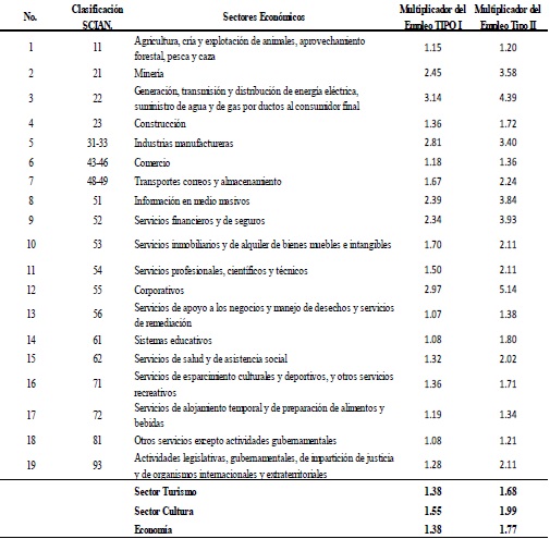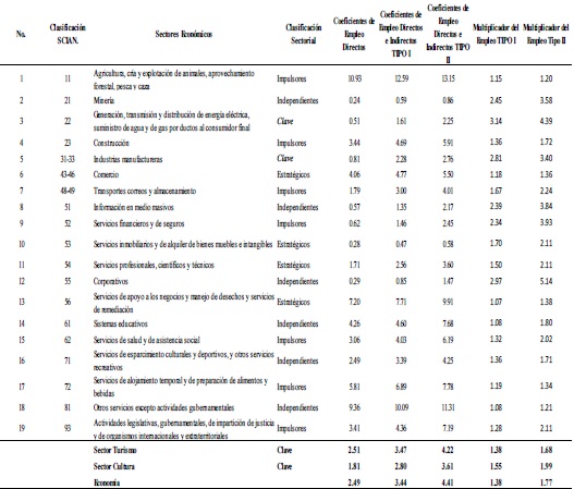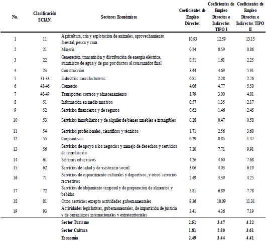 Con la aplicación de la metodología de eslabonamientos totales desarrollada por Rasmussen, se clasifica a los sectores turismo y cultural como sectores clave, con altos encadenamientos hacia atrás y adelante. La estructura interindustrial destaca que los sectores impulsores son los que potencialmente y estructuralmente pueden generar más empleos en la economía nacional, por tener los multiplicadores y coeficientes de empleo más elevados. Las relaciones interindustriales de los sectores económicos que establece el turismo y la cultura permiten elaborar indicadores de empleo de manera agregada para estas dos actividades económicas. Mediante la construcción de las matrices Tipo I y Tipo II de Leontief, se estimaron coeficientes de empleo, los cuales representan la cantidad de empleos por cada millón de pesos de gasto de inversión o gasto anual asociado a la demanda final en el sector económico. De esta manera, por cada millón de pesos de gasto en el sector turístico se generan 4.22 empleos directos, indirectos e inducidos (tipo II) y 3.47 empleos directos e indirectos (tipo I), de los cuales 2.51 corresponden a empleos directos. Mientras que en el sector cultural se generan 3.61 empleos (Tipo II) y 2.80 (Tipo I), de los cuales 1.81 son directos. En contraste, por cada millón de pesos de gasto en demanda final (PIB) en la economía nacional se generan 4.41 empleos directos e indirectos (tipo I) y 3.44 (tipo II), de los cuales 2.49 corresponden a empleos directos.