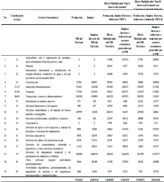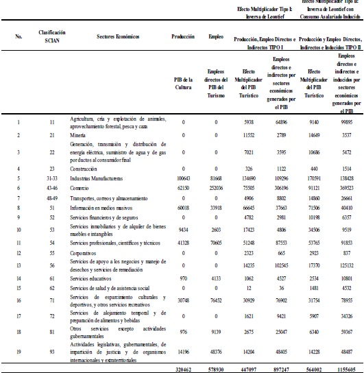 Estas restricciones del modelo no invalidan el uso del mismo porque los resultados muestran una radiografia de relaciones productivas del año de análisis, la extrapolación de los resultados si tendría que considerar algunas de estas restricciones. En este trabajo, se cuantificarán los efectos directos e indirectos (multiplicadores Tipo I) que el sector turismo y cultural, medidos por su gasto identificado en la cuenta satélite, producen sobre la economía mexicana en el empleo. Adicionalmente, cuantificamos los efectos inducidos del consumo doméstico, para lo cual se endogeneiza el consumo asalariado y se construyen los multiplicadores Tipo II.