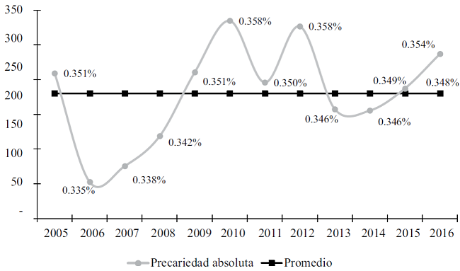 De los principales resultados obtenidos se puede observar que para el periodo comprendido entre 2005 al 2016, la precariedad absoluta nacional promedio fue de 0.348%, sin embargo, no se comporta de forma constante.1 En la Gráfica 3 se puede observar que el nivel más bajo de precariedad fue para el año 2006, a partir de entonces y hasta el 2010 la precariedad absoluta aumentó, tocando su punto máximo en el 2010, probablemente afectado por la crisis del 2008.