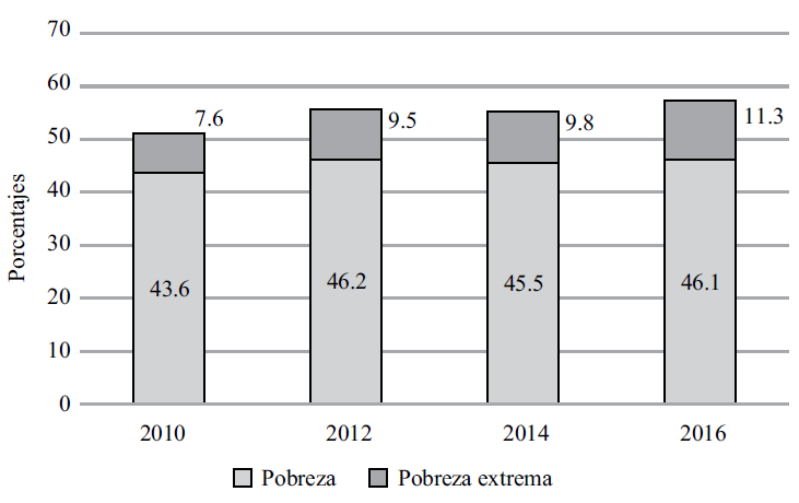 Esquivel (2015) muestra que en México la riqueza del país está concentrada en una pequeña parte de la población, dejando a la mayoría de los habitantes en la clase media o en situación de pobreza. De acuerdo con el Informe Multidimensional de Pobreza del CONEVAL para el 2016 el porcentaje de la población que se encontraba en situación de pobreza fue de 43.6 por ciento, cifra menor al 46.2 por ciento reportado en 2014. Asimismo, en 2016 el 7.6 por ciento de la población se encontraba en situación de pobreza extrema, cifra menor al 9.5 por ciento en 2014. La evolución de estos niveles de pobreza se puede observar en la Gráfica 4.