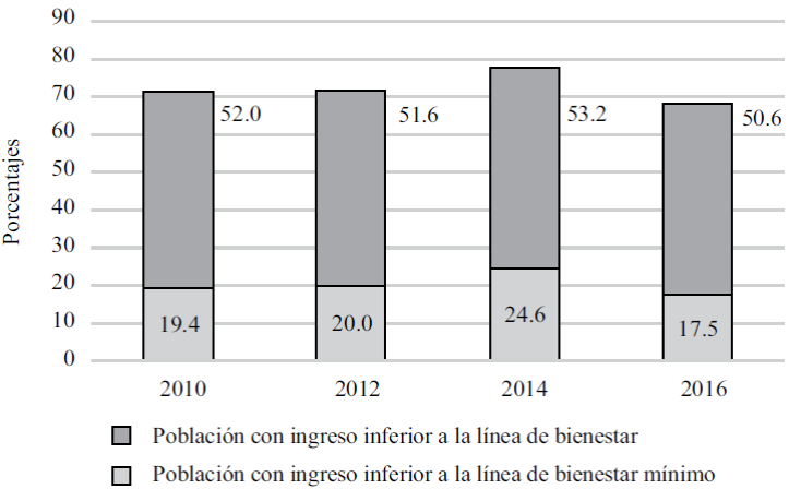 Respecto a la población con ingreso inferior a la línea de bienestar mínimo, para el 2016 el CONEVAL registró el 50.6 por ciento de la población con ingresos por debajo de la línea de bienestar que comprende la canasta básica alimentaria y no alimentaria, y al 17.5 por ciento de la población por debajo de la línea de bienestar mínimo que sólo comprende la canasta alimentaria, lo que se traduce en 21.4 millones personas que no contaron con el ingreso suficiente para acceder a la canasta básica en 2016. Esto se puede ver en la Gráfica 5.