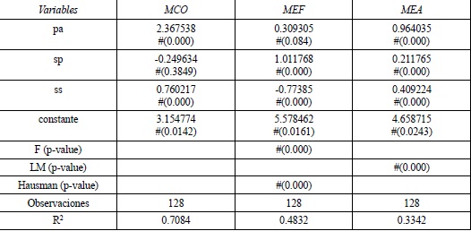 De acuerdo con Greene (2002), la metodología de datos panel consta de tres modelos: el de datos agrupados, el de efectos fijos donde el efecto específico del individuo es una variable aleatoria que se puede correlacionar con las variables explicativas y el de efectos aleatorios donde el efecto específico del individuo es una variable aleatoria que no está correlacionada con las variables explicativas.