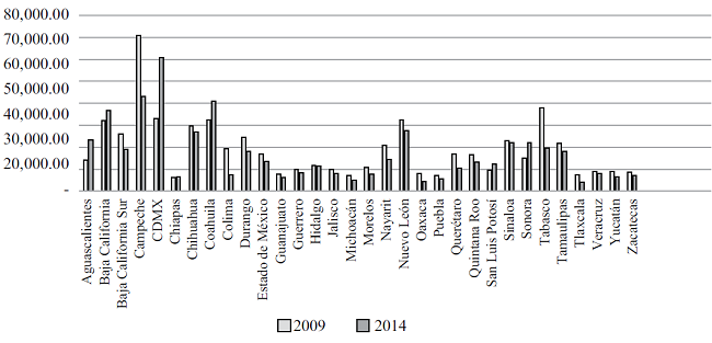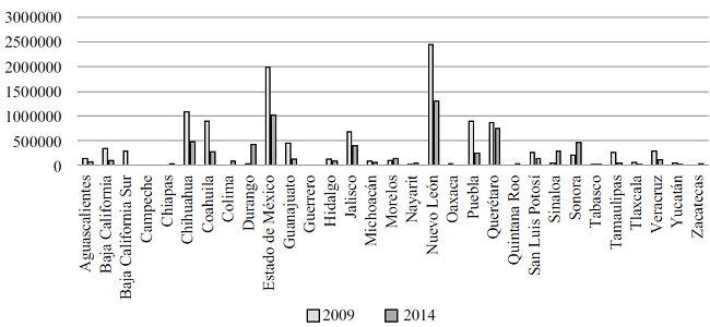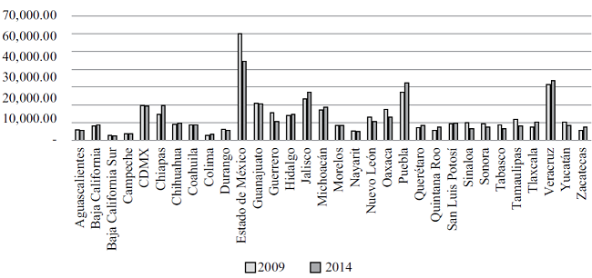 Durante los últimos años, el emprendimiento ha tenido un fuerte impulso a través de políticas públicas y empresariales, pensando que puede ser una vía apropiada para fortalecer la estructura empresarial del país y para dinamizar los mercados laborales. A nivel de las entidades federativas las acciones en la materia también han cobrado fuerza pero a distintos ritmos e intensidad. Cabe apuntar que la mayoría de las iniciativas emprendidas están orientadas fundamentalmente a fortalecer el segmento de las micro, pequeña y mediana empresa. En la Gráfica 1 se reporta un comparativo de la cantidad de emprendimientos realizados por estado durante los años de 2009 y 2014, precisando que el dato es global debido a que integra empresas de distinto tamaño, pero siendo predominante el número de micros y pequeñas empresas. La información revela que los estados con un mayor número de apertura de empresas son el Estado de México con un registro 60,080 en 2009 y 44,279 en 2014. También destaca el estado de Veracruz con 31,268 y 33,557 respectivamente, Puebla con 26,899 y 32,321, Jalisco 23,187 y 27,126, Guanajuato 20,830 y 20,460 y Chiapas con 14,697 y 19,619 registros respectivamente. En contraste, los estados que presentan una menor actividad emprendedora en los mismos años son, Baja California Sur con 2,818 y 2,344 emprendimientos respectivamente, Colima 2,852 y 3,180, Nayarit 5,114 y 4,931, Quintana Roo 5,524 y 7,400, Zacatecas 5,524 y 7,334 y Tabasco con 8,602 y 3,552. En lo que concierne a los casos más sobresalientes, el Estado de México, Puebla, Veracruz y Jalisco destacan en el contexto nacional (véase Gráfica 1).