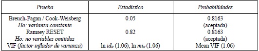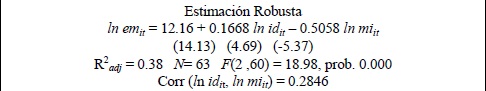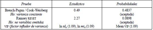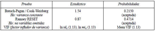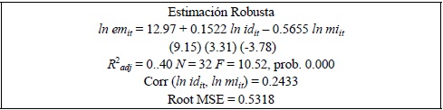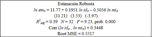 Donde i denota a cada entidad federativa de la República Mexicana y t refiere a los años de estudio correspondientes a 2009 y 2014. La variable emit representa el nivel de emprendimiento, mientas que idit y miit, denotan la inversión privada en I+D y el marco institucional en términos de costos de apertura respectivamente. De acuerdo a lo expuesto en la primera sección del documento, se esperaría que la variable de I+D se relacionara positivamente con el nivel de emprendimiento y que los costos de apertura incidieran negativamente, de tal manera que ϕ1 > 0 y ϕ2 < 0. En la Tabla número 1 se reportan los resultados de la estimación de la Ecuación [4] a través del método de MCO contemplando una estimación robusta. Así mismo, se reportan en la Tabla número 2 las pruebas de diagnóstico tradicionales para constatar que no hay problemas de heterocedasticidad, especificación y colinealidad