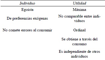 Respecto al tema de preferencias, Stigler y Becker (1977) elegían no discutirlas, señalando que no era competencia de economistas y que éstas debían emplearse únicamente como dato. En el mismo sentido Friedman (1962) sugirió tratar las preferencias como exógenas, pues consideraba que la formación de éstas era tarea de psicólogos, mientras la responsabilidad de los economistas era delinear las consecuencias de dichas preferencias. Los postulados predominantes acerca de los individuos y la utilidad son presentados en la tabla 1.