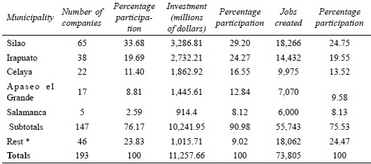 Regarding to the attracted investment in the automotive industry, during the 2006-2016 period, 91% concentrated in the following 5 municipalities in order of importance: Silao, Irapuato, Celaya, Apaseo el Grande, and Salamanca (Martínez and Carrillo, 2017).