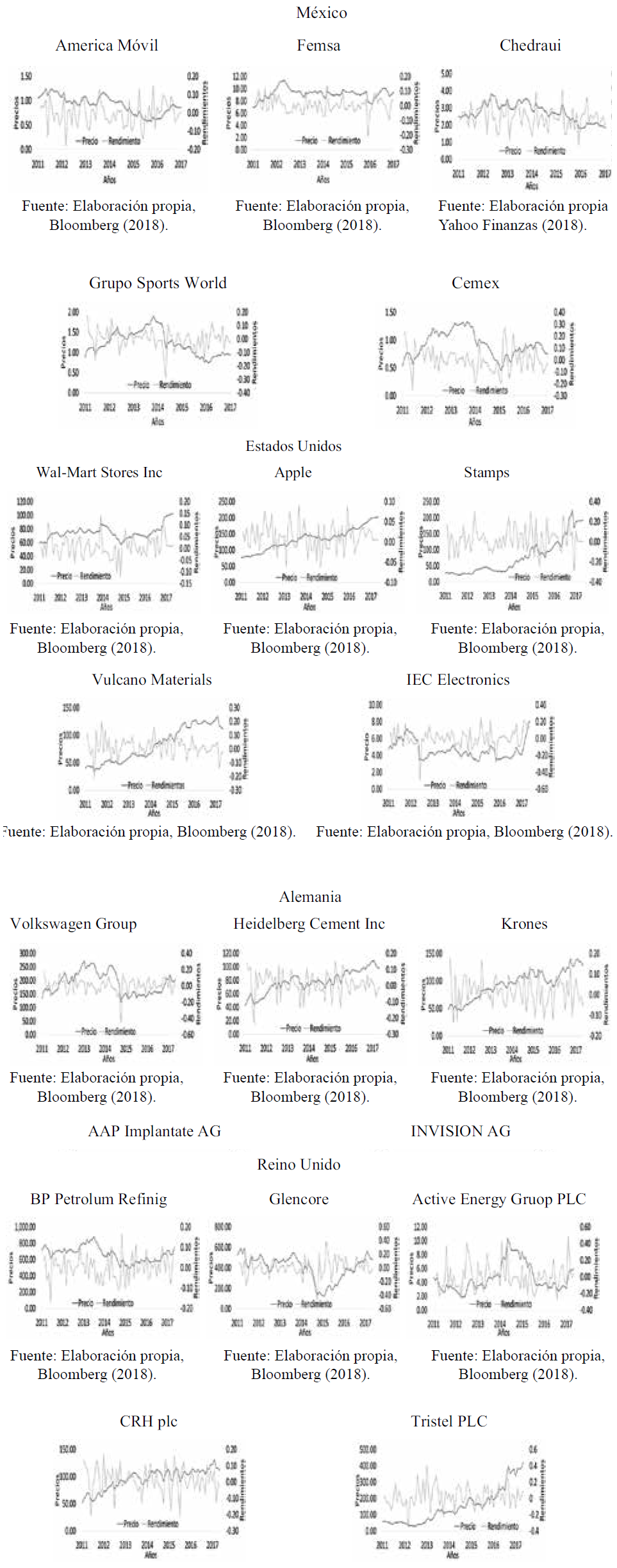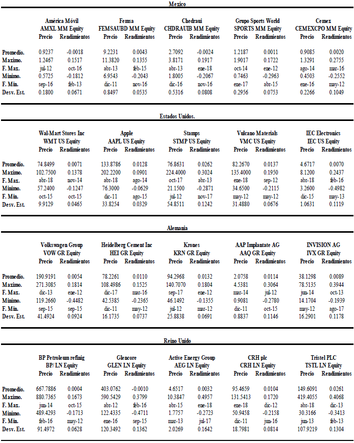 Una vez analizados gráficamente los instrumentos empleados en la estrategia “ETFs”, La gráfica 2 da cuenta de la evolución de los precios y rendimientos de las acciones que componen el portafolio “tradicional”. Relacionado con el comportamiento de los ETFs, las acciones mexicanas presentaron un comportamiento estable e incluso positivo, previo al año 2014, a partir de dicho año la volatilidad incrementó y cayeron los precios de la mayoría de los activos. Lo anterior se puede deber a diversos aspectos vinculados con los efectos de la crisis: volatilidad del tipo de cambio, ralentización de la economía e incertidumbre a nivel global. De modo contrario, el desempeño de las acciones estadounidenses fue positivo, en todas ellas se observa una tendencia creciente, sobre todo a finales del periodo. Lo anterior se puede explicar a partir de la recuperación de la economía de EE. UU. después de la crisis económica que presentó en el año 2007. Las acciones alemanas, dos de las cinco analizadas, tuvieron tendencias positivas en los precios, mientras que las tres restantes experimentaron caídas en los precios en los años 2014 y 2015, lo anterior se pudo deber a la incertidumbre y diversos acontecimientos internacionales. Finalmente, las acciones de Reino Unido mostraron efectos combinados, dos de las cinco dibujaron tendencias positivas, mientras que las tres restantes, no tuvieron una tendencia definida a lo largo del periodo de estudio.3