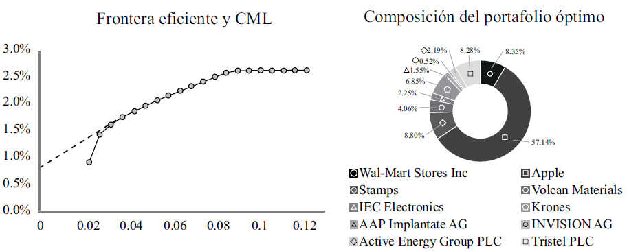 Una vez que se analiza la evolución de los activos propuestos para la implementación de las distintas estrategias de inversión, se aplica el modelo de Markowitz para obtener el rendimiento máximo a diferentes niveles de riesgo. Para elegir el portafolio óptimo, se recurre a la construcción de la CML o línea del mercado de capitales. La línea del mercado de capitales (CML) es la línea tangente trazada desde el punto del activo libre de riesgo a la región factible para los activos con riesgo; describe el trade off que existe entre riesgo y rendimiento para los portafolios eficientes. Es un concepto teórico que representa los portafolios óptimos que combinan activos libres de riesgo y activos riesgosos. Así, la línea del mercado de capitales es la línea que hace tangencia con la frontera eficiente, mostrando el punto que ofrece el mayor rendimiento esperado a un nivel de riesgo dado.