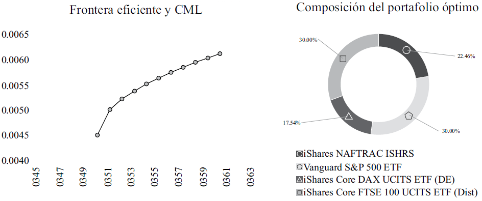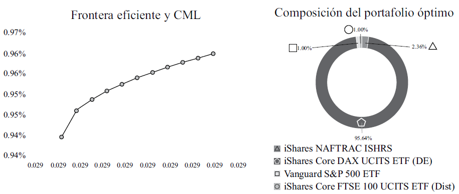 Como es de esperarse, el ETF que replica el mercado estadounidense es aquel que toma la participación máxima posible, al igual que ocurre con aquel que replica el índice de Reino Unido, el tercer ETF con mayor participación es el seguidor del índice mexicano y, por último, el ETF con menor participación en la cartera con 11.8% el ETF del mercado alemán.