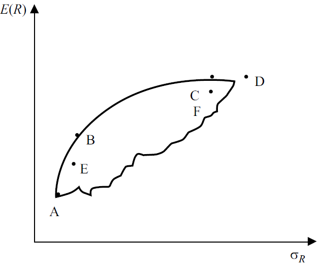 En la Figura 1 la frontera eficiente es la curva AD. El área sombreada corresponde al conjunto de inversiones posibles. En la frontera eficiente todos sus portafolios son eficientes. Por ejemplo, los portafolios ABCD son eficientes en cuanto a la media y varianza de los rendimientos. Los portafolios E y F muestran una combinación posible de activos, pero dichos portafolios no son eficientes.
