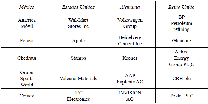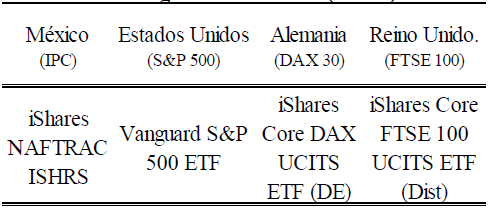 Para comparar las dos estrategias de inversión, se emplean dos tipos de activos: ETFs y acciones. En la estrategia de inversión “ETFs” se utilizan los precios de cierre mensual de los ETFs sobre los índices: S&P 500 (Estados Unidos), DAX (Alemania), IPC (México) y FTSE100 (Reino Unido); mientras que, para la estrategia “tradicional” se emplean datos de las principales cinco acciones de las economías antes mencionadas, la tabla 1 muestra dichos activos por país.