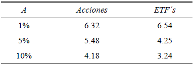 La tabla 3 muestra los resultados del Valor en Riesgo estimado a través del método histórico. Los resultados son mixtos, ya que dependiendo del nivel de confianza elegido, una estrategia domina sobre otra. Al 1%, las diferencias son pequeñas, pero el portafolio conformado por ETFs presenta una pérdida mensual potencial mayor; mientras que, para los niveles 5 y 10%, la estrategia de acciones presentó mayores pérdidas potenciales. Es decir, por cada $100 dólares de inversión en la cartera, conformada por acciones, la pérdida máxima del portafolio sería de 6.32 dólares, mientras que para la cartera conformada por ETF´s sería de 6.54 dólares con una probabilidad del 99%.