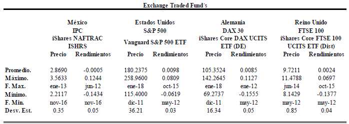 En la gráfica 1 se resume la evolución en niveles y rendimientos de las series seleccionadas para la estrategia de inversión “ETFs”, lo que se puede observar es que existe, para los instrumentos que representan el índice alemán y el estadounidense, una tendencia positiva a lo largo de todo el periodo; mientras que, para los instrumentos que replican el índice mexicano e inglés, la tendencia es negativa. Para el caso de México, lo anterior está relacionado con el periodo de crisis, la cual afectó a países emergentes a partir de la caída generalizada de la actividad económica y de los precios de hidrocarburos y materias primas en el mercado internacional. En cuanto a la economía de Reino Unido, el desempeño a la baja del índice que replica el ETF podría estar relacionado con la crisis soberana y el BREXIT como fenómeno derivado de la misma.