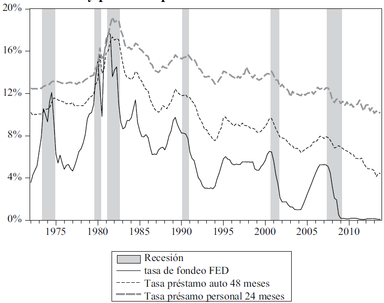 La gráfica 1 muestra el comportamiento de las tasas de interés de fondeo de la Reserva Federal, de los préstamos de auto a 48 meses y de los préstamos personales a 24 meses, las cuales son indicadores del costo del dinero a corto plazo, en el caso de la primera, mientras las dos restantes pueden representar el comportamiento del mercado de crédito para los hogares.