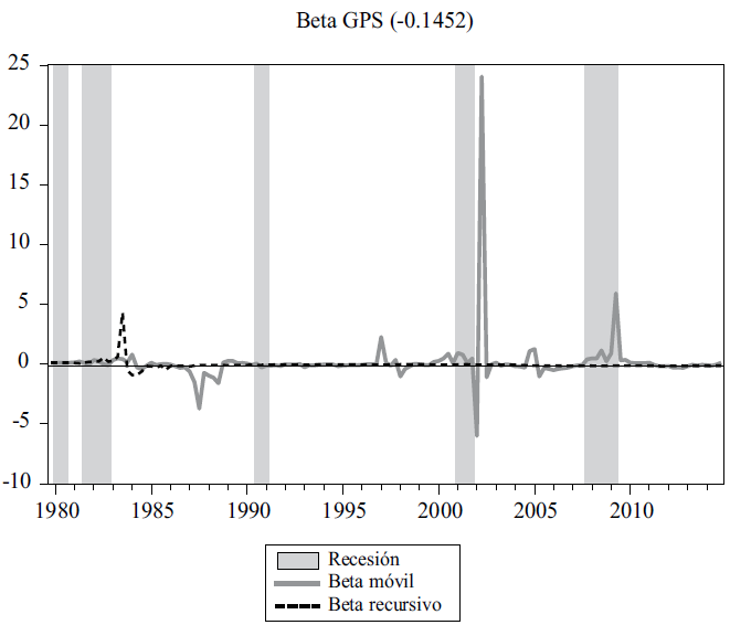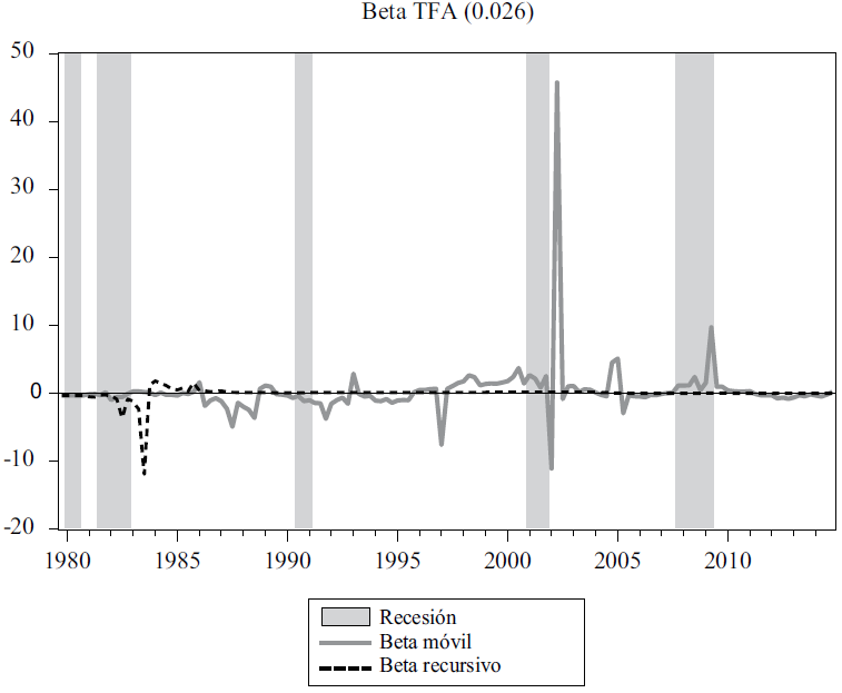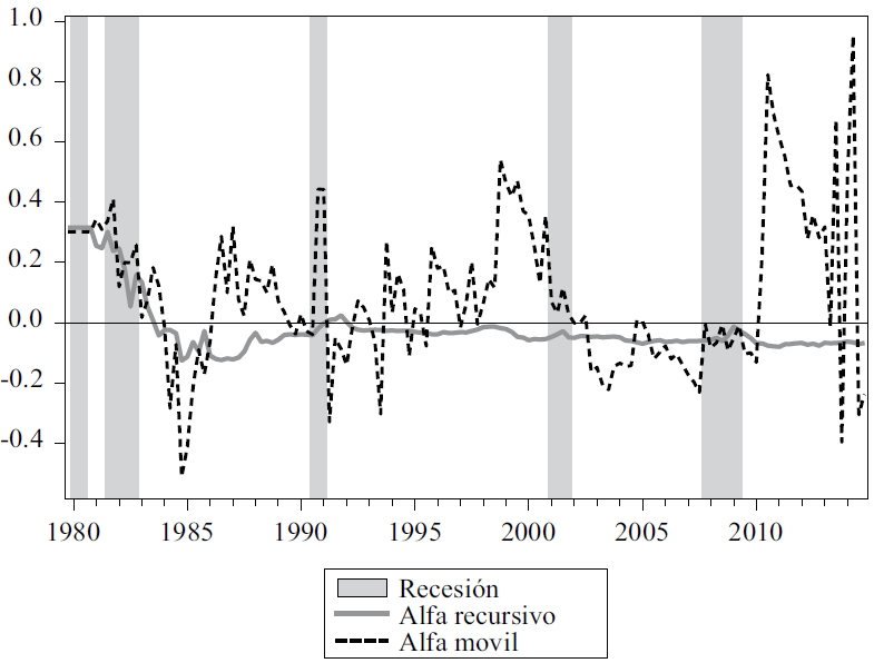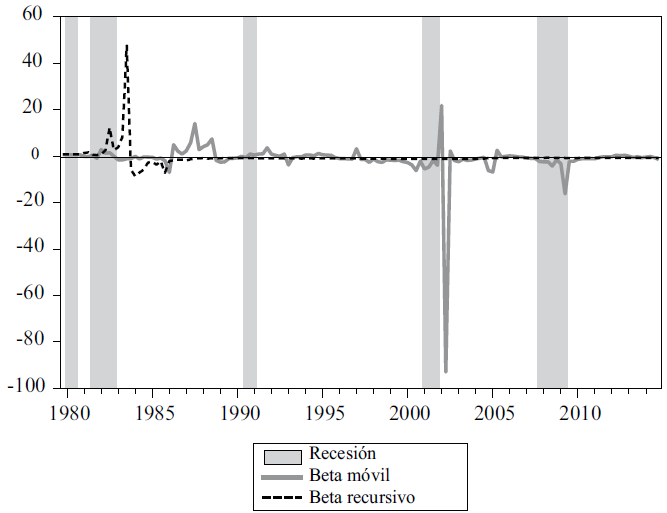 Entonces el valor recursivo apunta a la posibilidad de cointegración entre las variables prácticamente durante todo el periodo a partir de 1984. Mientras los resultados de la ventana movible muestran importantes variaciones a través de la muestra, con especial énfasis en el periodo posterior a la crisis de 2007-08, lo cual apunta que localmente los valores de las observaciones se desvían de forma marcada de la relación de largo plazo, efecto remarcado gracias al tamaño de la muestra; de lo cual resalta la tendencia creciente de estos valores en los periodos de expansión con excepción del ubicado entre la recesión de 2001 y la “Gran Recesión”.